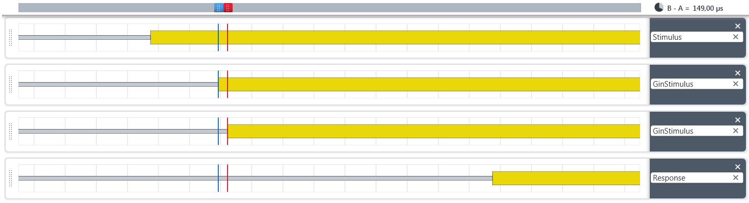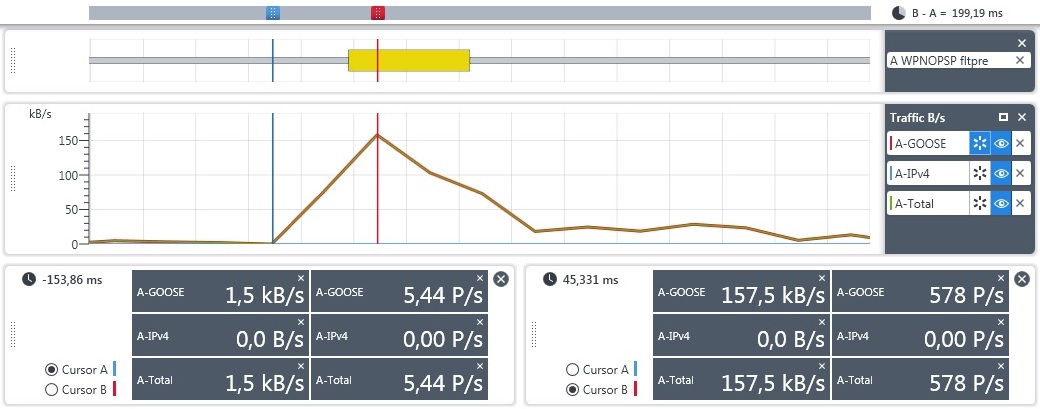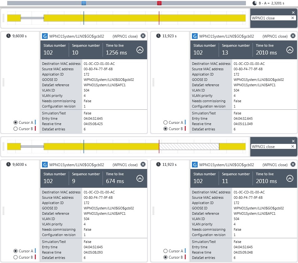 Рис. 6. След выше представляет полную последовательность GOOSE-сигналов на одной подстанции, в то время как на второй подстанции есть два заметных пробела (синие и красные курсоры). Во втором пробеле отсутствует целый ряд повторных передач, зафиксирован даже тайм-аут GOOSE-сигналов (виден в заштрихованном столбце).