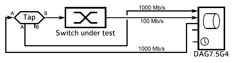 Реальную схему ЛВС эквивалентировали одним коммутатором, обладающим двумя гигабитными портами и одним стомегабитным интерфейсом; полнодуплексным Ethernet-пробником (NetOptics 10/100/1000 Tap); высокопроизводительным ПК с прецизионным четырехпортовым (1 Гб/c) сетевым интерфейсом, обладающим интерфейсом синхронизации времени 1-PPS и обеспечивающим возможность присвоения меток времени входящим пакетам с абсолютной погрешностью не более ±100 нс и относительной погрешностью (по данным, регистрируемым на 4 портах) не более ±8 нс (Endace DAG7.5G4). Всё оборудование было соединено между собой по схеме, изображённой на рис. 2.