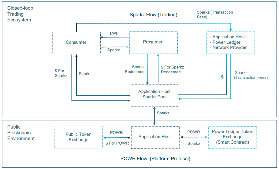 Программная платформа компании Power Ledger является своего рода экосистемой, которая описывает взаимоотношения между множеством ценовых предложений и единицами мощности посредством предоплаченных токенов. Рыночная гибкость поддерживается за счет двойной системы токенов POWR (на базе ERC20) и Sparkz, где первая отвечает за доступ к платформе, т. е. к программному продукту, а вторая применяется для взаиморасчетов и привязывается к конкретной валюте. Это дает возможность организациям и участникам комбинировать и конфигурировать свои собственные приложения на платформе, осуществляя обмен между этими системами токенов.