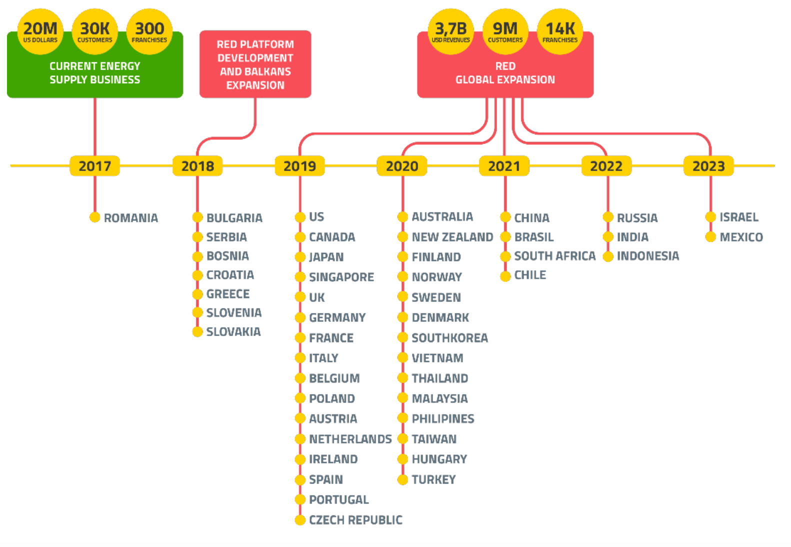 Блокчейн-платформа RED создана компанией Restart Energy (Румыния) — европейским поставщиком энергоресурсов с текущим оборотом в $20 млн. Компания также смогла в начале 2018 года привлечь $30 млн на ICO. Restart Energy фокусирует свои усилия на либерализации рынка ресурсов и снижении степени влияния на эти рынки естественных монополий на мировой арене. Сегодня основными активами компании являются клиентская база в 27 000 домохозяйств и 3 000 юридических лиц. Ежемесячный прирост клиентской базы составляет примерно 2 000 клиентов в месяц. Компания Restart Energy создает глобальный портал для одноранговой торговли энергоресурсами с полностью децентрализованной системой, которая основана на блокчейн-технологии в том числе, совмещающей в себе сопряженные технологии искусственного интеллекта, обработки больших данных и интернета вещей. RED-экосистема включает в себя следующие подсистемы: RED-платформа (RED-P), RED-франшиза (RED-F) — и токены MWAT и KW.