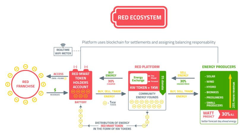 RED-франшиза — это торговая франшиза, которая предназначена для существенного упрощения входа на рынок торговли энергоресурсами для индивидуальных предпринимателей или организаций; она предоставляет им возможность начать покупать и продавать электроэнергию на открытых мировых рынках. Токены MWAT являются крипто-токенами, которые позволяют виртуально хранить электроэнрегию и торговать ею в объеме до 1 МВт·ч в месяц на платформе RED. Один токен приравнивается к 0,11 кВт·ч. Отмечается, что один MWAT — это $0,1. Торговая платформа RED-P — это программное обеспечение для глобального энергоснабжения. Потребители и производители электроэнергии, зарегистрированные на площадке, получают: