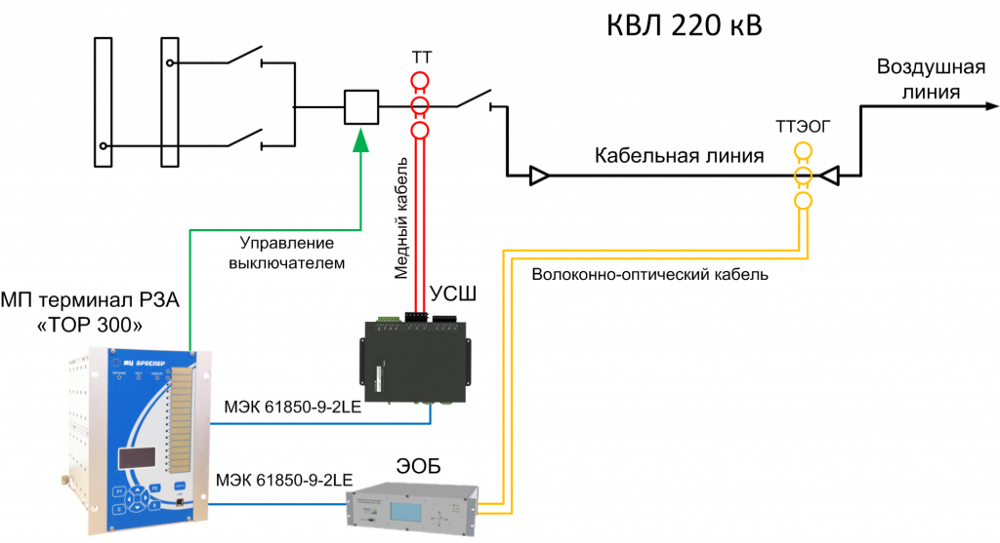 Упрощенная схема реализации ДЗЛ с использованием электронно-оптических трансформаторов тока и УСШ на противоположных концах кабельной вставки линии 220 кВ / «Профотек»