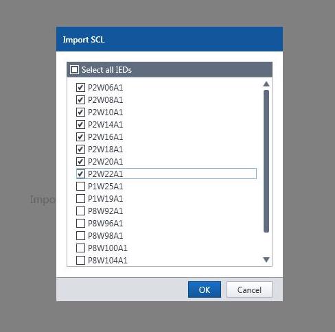 The configuration software was idle for a while, and then rejected our file declaring timeout error. We had no doubt that the SCD file was valid so we decided to select just a few IEDs (all belonging to one section), and the import turned out a success. By playing around with the procedure, we found out that it was possible to pick thirteen IEDs at the most. The reason for this behavior is still to be revealed.