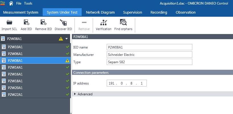 Once the file was put into the DANEO software, we needed to select which of the IEDs present on the file would be inspected (Fig. 2). We had a total of 17 IEDs listed (two busbar sections).