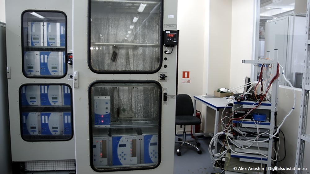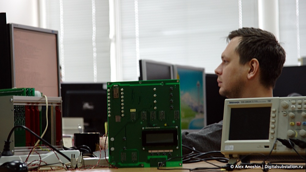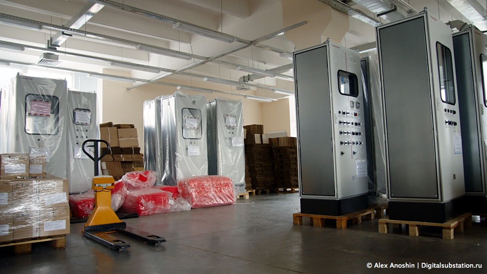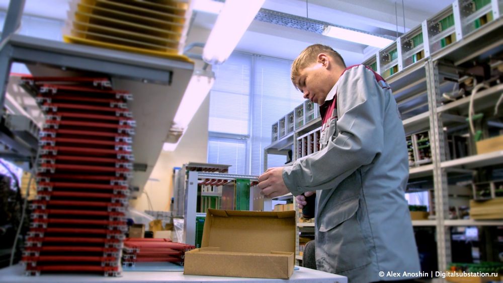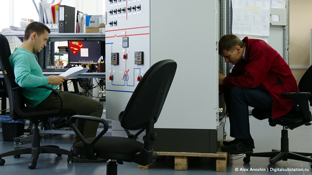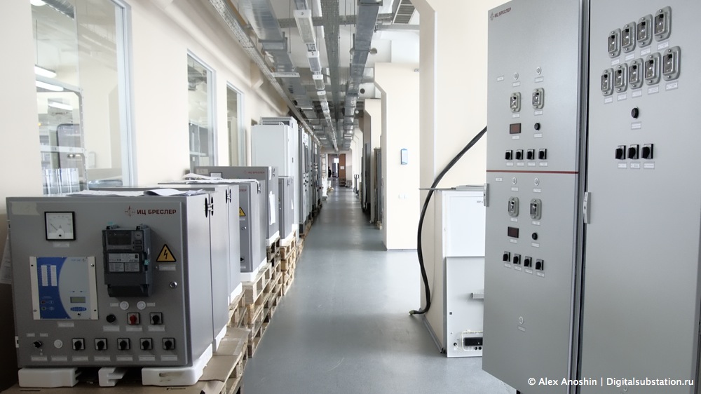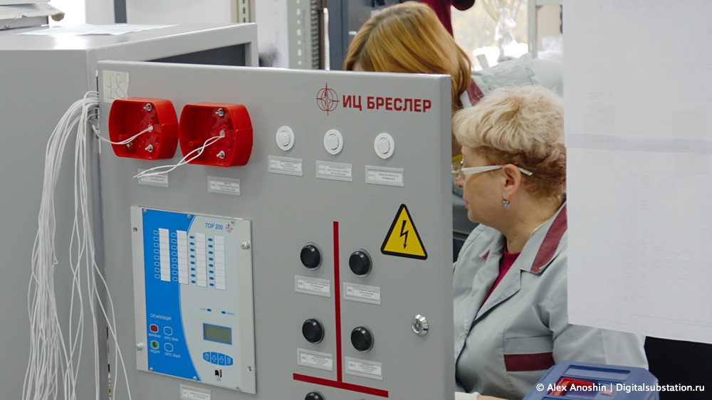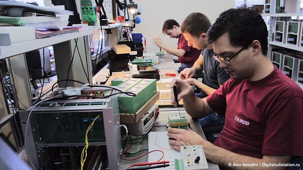 С поезда меня встретил Дмитрий Афанасьев, заведующий отделом по связям с общественностью и рекламе в ИЦ Бреслер. Мы пешком дошли до офиса ИЦ Бреслер. Первое впечатление, которое сложилось, когда мы подходили ко входу в офис было примерно таким: «ого, какое большое здание, а у ИЦ Бреслер маленькое крылечко». Как выяснилось позже, оно было ошибочным. Это становится понятно сразу после того, как пройдя мимо охраны, попадаешь на второй этаж, где коридор с кабинетами направо и налево уходит далеко в глубь. Административная часть офиса во всех компаниях более-менее одинаковая: бухгалтерия сидит в своих кабинетах, менеджеры по продажам и пиарщики в опенспейсе. Я сразу обратил внимание на большой конференц-зал справа. За полупрозрачными стёклами я узнал силуэт Ивана Голикова, он руководитель направления МЭК 61850 в ИЦ Бреслер, и мы уже достаточно давно знакомы. Иван проводил для сотрудников компании семинар на тему МЭК 61850, в зале было человек 30-40, наверно. Мне показалось, что это очень здорово. Вообще внутрикорпоративные семинары — это полезная штука: очевидно, что во всём разобраться не всегда можно, а когда кто-то, разобравшись, готов рассказать об этом другим — это крайне полезно для развития компании. Позднее, я поговорил с Иваном, он сказал, что это уже не первая лекция по стандарту, которую он проводит в компании — их целый цикл. Производство ИЦ Бреслер // Фото: © Алексей Аношин // Цифровая подстания // Digitalsubstation.com Со второго этажа мы сразу отправились на четвёртый, где размещается производство и склад готовой продукции. Собственно, на этом этаже и совершаются чудеса: набор плат, металлоконструкий и проводов превращается в терминалы и шкафы РЗА. Здесь мы прошли по всей производственной цепочке за исключением, правда, монтажа компонентов на печатных платах — он производится в отдельном цеху. Производство ИЦ Бреслер // Фото: © Алексей Аношин // Цифровая подстания // Digitalsubstation.com В левом крыле четвертого этажа осуществляется сборка терминалов релейной защиты: готовые платы с размещенными на них компонетами собираются на каркасах и устанавливаются в корпуса вместе с блоками питания, элементами управления и индикации, производится весь электромонтаж. Производство ИЦ Бреслер // Фото: © Алексей Аношин // Цифровая подстания // Digitalsubstation.com Здесь же осуществляется тестирование. Готовые терминалы помещают в «печки», где они стоят под нагрузкой при температуре 55 градусов в течение суток. Это позволяет выявить все скрытые дефекты, которые не были выявлены на ранних этапах. После «печки» все терминалы вновь проходят сквозную проверку работоспособности. Производство ИЦ Бреслер // Фото: © Алексей Аношин // Цифровая подстания // Digitalsubstation.com В правом крыле этого же этажа собираются шкафы релейной защиты. В подготовленные металлоконструкции устанавливаются уже готовые терминалы РЗА, производится весь электромонтаж в соответствии с рабочими проектами и в завершение — тестирование готового шкафа. Производство ИЦ Бреслер // Фото: © Алексей Аношин // Цифровая подстания // Digitalsubstation.com Как рассказал Дмитрий, шкафы покупают только Rittal. Был опыт взаимодействия с другими производителями, но качество подводило — в итоге решили не экономить и сделать ставку на качество. Наряду со стандартными шкафами РЗА для крупных объектов я заметил и съемные релейные отсеки яче