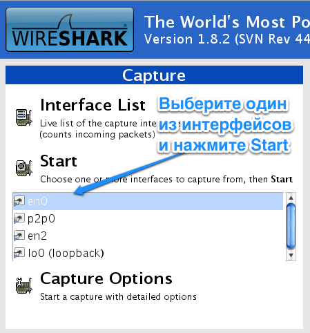 Открываем Wireshark и в главном окне программы выбираем интерфейс, посредством которого ПК включен в сеть Ethernet.