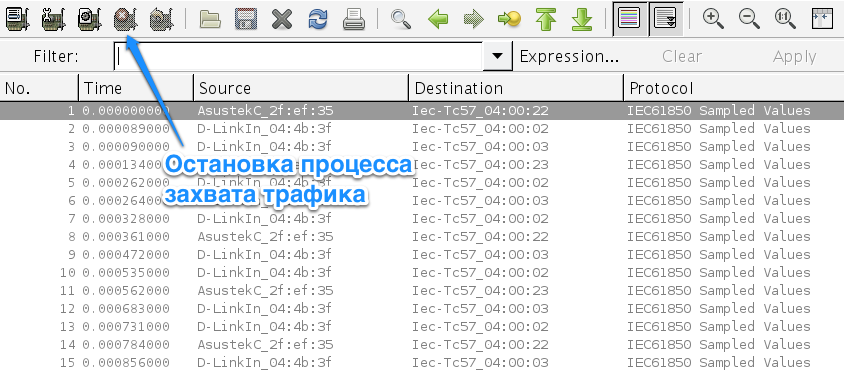 Для того, чтобы начать захват данных из сети требуется нажать левой кнопкой мыши по интересующему нас интерфейсу. После этого откроется окно, в котором в режиме онлайн будет отображаться весь входящий и исходящий трафик. Через некоторое время остановите процесс захвата данных, чтобы проанализировать его, для чего нажмите на иконку отмеченную на рисунке: