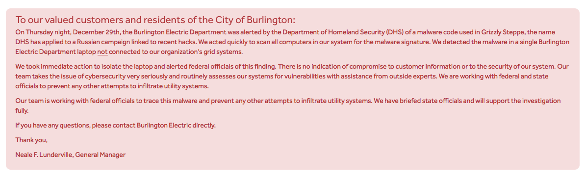 заявления Burlington Electric Department, размещенного на сайте компании следует, что вредоносное ПО было обнаружено на ноутбуке одного из сотрудников, не связанном с технологической сетью компании. Уточняется, что надёжности электроснабжения потребителей ничто не угрожает.