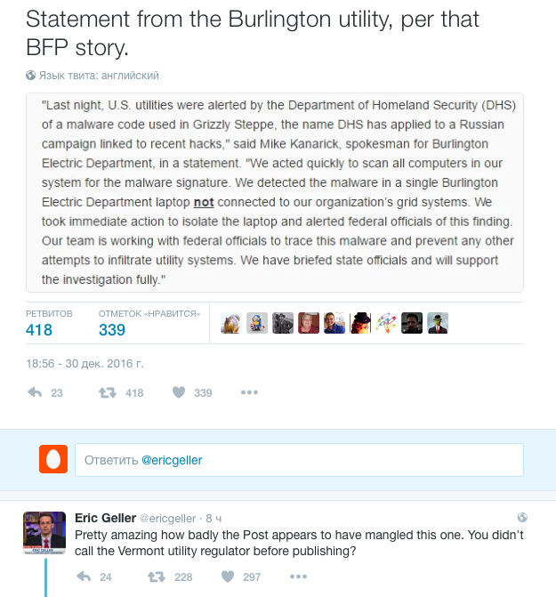 публикации в The Washington Post, размещённой, если судить по информации на сайте, поздно вечером 30-го декабря (или рано утром 31-го по Московскому времени) в сети одной из энергоснабжающих компаний Вермонта найдено вредоносное ПО, связанное с хакерами из России. Каких-либо действий предполагаемые хакеры не предпринимали, скорее всего просто проверяя сеть на возможность проникновения, уточняется в сообщении Washington Post. Найденное на компьютере Burlington Electric Department вредоносное ПО по информации Washington Post связано с Grizzly Steppe — именно так