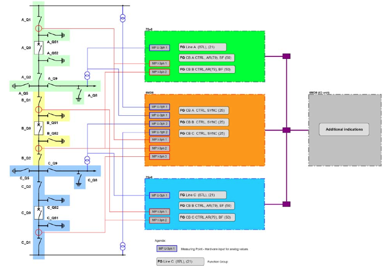 Возможно также применение разных ИЭУ для реализации функций основных и резервных защиты, например, 7SD8 и 7SA8. В качестве контроллера присоединения и дополнительного устройства индикации предполагается применение ИЭУ серии 6MD8. Ознакомиться с методическими указаниями можно по этой ссылке.