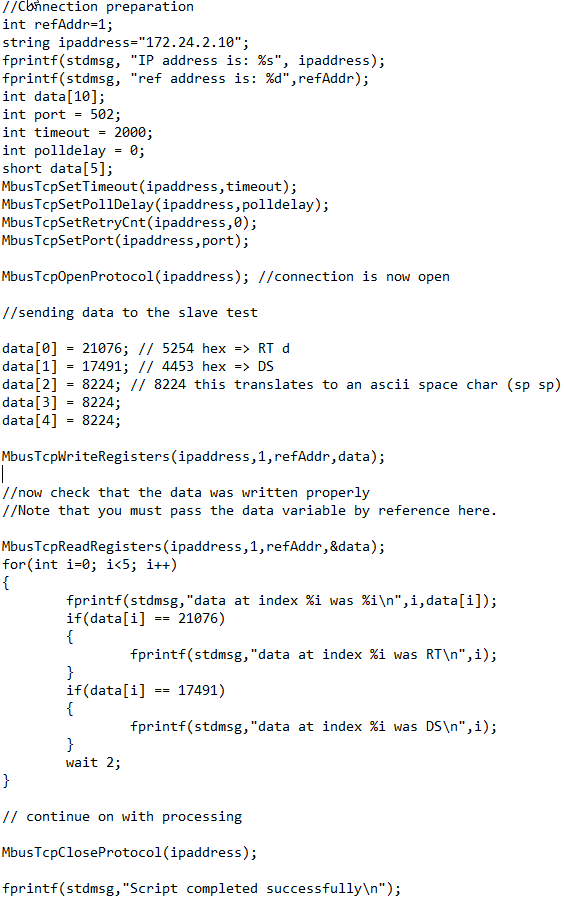 A computer running RSCAD poses as the master, and will interact with and control an external slave device. A typical scenario would include configuring an external device (a relay for example) and then running a set of tests and documenting the behavior of the relay. With the addition of the MODBUS script commands, equipment testing can be automated even further because the relay can be controlled directly from the script. This allows the script to change the relay settings and continue testing without any manual intervention. Both MODBUS TCP and serial commands are supported. In order to implement an example case of MODBUS communication, MODBUS slave test tool is used. A script file is developed to send/receive information to/from slave test tool (For more information about RTDS script files, please refer to Chapter 7 of the RSCAD tutorial). Figure 1 shows the script which is used in this particular example.