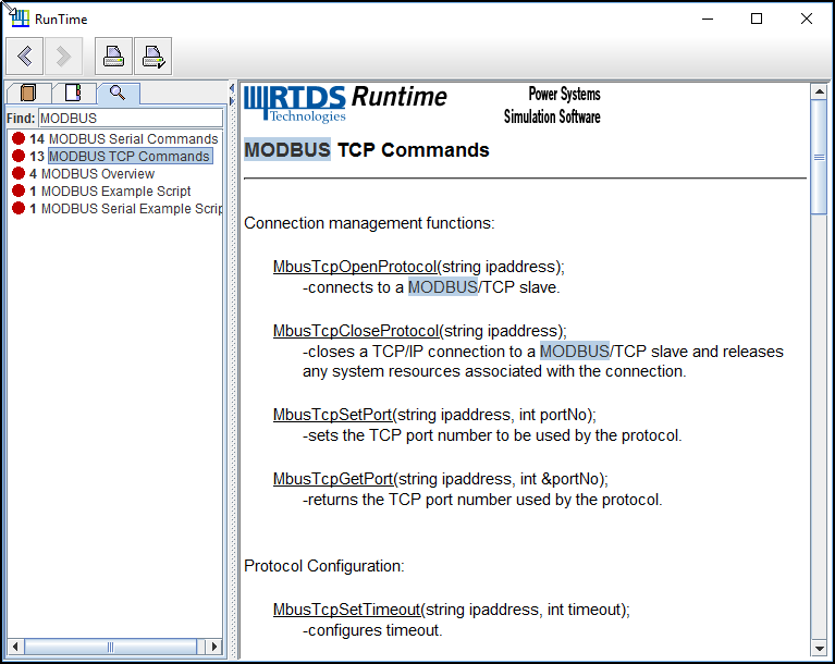Figure 2: RSCAD Runtime help for MODBUS