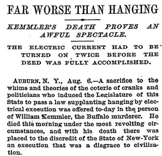 В 1890 году через тело Кеммлера пропустили два мощных разряда переменного тока напряжением 1,3 кВ каждый. А уже на следующий день появилась статья с громким заголовком «Вестингауз казнил Кеммлера». Казнь выглядела настолько мерзко, что сам Вестингауз мрачно заметил: «Топором бы у них вышло лучше». В итоге он отказался поставлять генераторы переменного тока для казни на электрическом стуле.