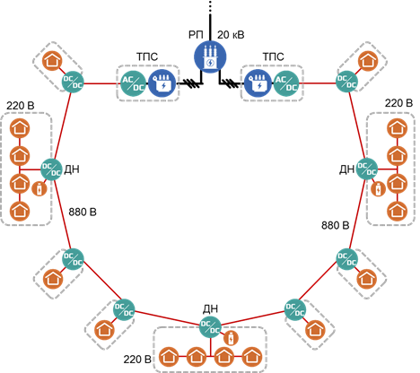 Схема электроснабжения на постоянном токе, которую предлагаем мы, представляет собой замкнутые кольца постоянного тока 880 В — по кольцу на микрорайон. Каждое кольцо опирается на две понижающие тяговые подстанции с одним трансформатором и активными выпрямителями напряжения. На каждое кольцо подключены все здания микрорайона, каждое здание имеет ввод и вывод, которые могут автоматически, в случае аварийной ситуации, меняться за счет управления уровнем напряжения, так, чтобы поток мощности мог идти по кольцу по любому из направлений. Это обеспечивает существенное повышение надежности без резервирования трансформаторных мощностей. И в такой схеме вообще нет необходимости в трансформаторных подстанциях.
