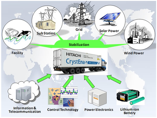 Energy_storageКомпания Hitachi разработала комплектный накопитель электроэнергии "CrystEna". Накопитель предназначен для промежуточного хранения энергии, произведенной нетрадиционными источниками.Основу накопителя составляет литий-ионный аккумулятор мощностью 1 МВт, произведенный «Hitachi Chemical Co». Испытания нового устройства стартуют в начале 2014 года в северной Америке и продлятся в течение 3-х месяцев, коммерческая поставка планируется к концу 2015 года. По мнению экспертов Hitachi, потенциальный размер рынка, охватываемого продуктом "CrystEna" в США к 2020 году составит 7,5 ГВт. Источник: Hitachi.com