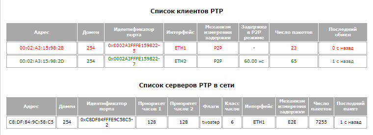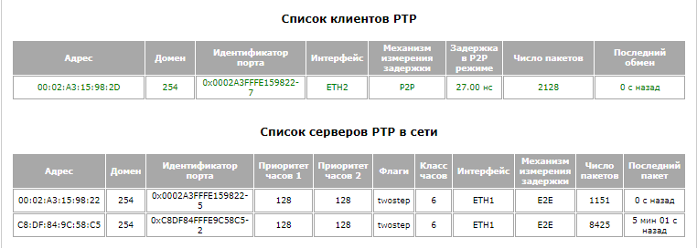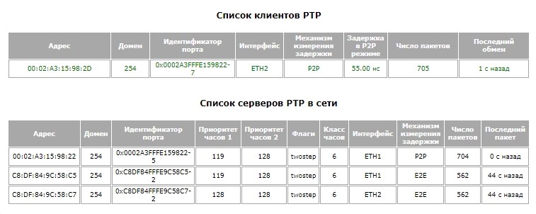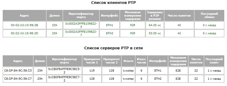 Рис. 13. Список клиентов и серверов РТР при работе портов 1 и 2 ИСС-2 в режиме РТР