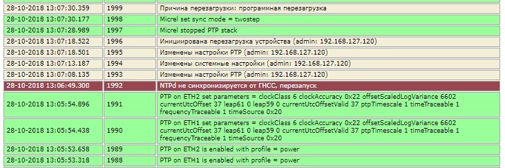 Раздел «Журнал событий» показан на рис. 15. Как видно из журнала событий, все наши действия по изменению параметров сервера времени зафиксированы. Стандартная палитра событий: зеленые — системные, серые — фиксация изменений пользователем, красные — ошибки. На наш взгляд, для отечественного продукта не хватает полноценной русификации всего журнала событий [6].