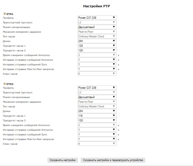 Как видим, два порта ИСС-2 параметрируются независимо. Первая строка параметрирования «Профиль» предлагает устанавливать заранее подготовленные в соответствии с IEEE 1588 профили работы ИСС-2 как сервера времени (мастера). Виды профилей и настройки остальных параметров приведены в таблице 5.