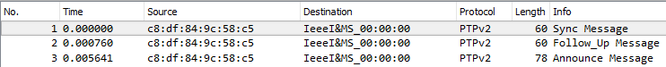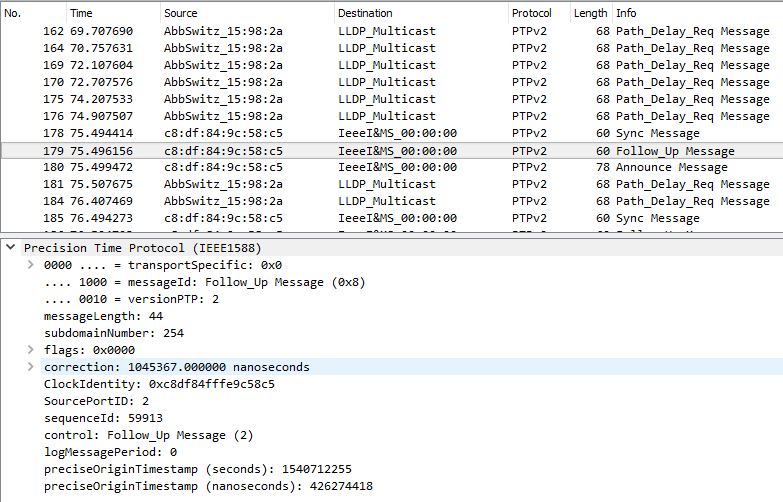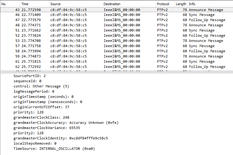 Первоначально мы включили на ИСС-2 профиль Power (2 step) и посмотрели, какие пакеты он шлет (результаты см. на рис. 21). С точки зрения последовательности пакетов — все корректно. Далее мы подключаем ИСС-2 к коммутатору, на котором включен режим прозрачных часов (см. рис. 22). Как видно на рис. 22, в сети, к которой подключен ПК с WireShark, отслеживаются пакеты от ИСС-2 (Announce, Sync и FollowUp), а также запросы коммутатора Delay_Request на измерение задержки в канале связи.