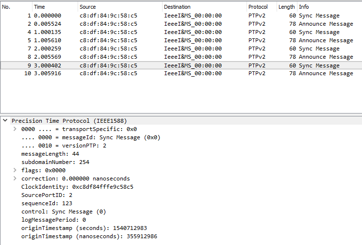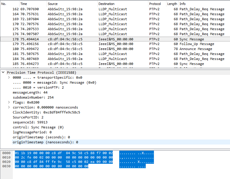 При включении на ИСС-2 режима 1 step в сообщении Sync метка времени не равна нулю, а сообщения типа FollowUp не формируются (рис. 25).