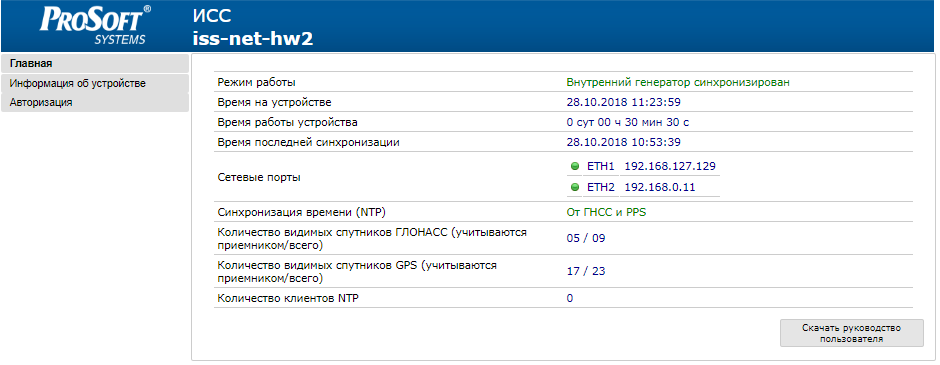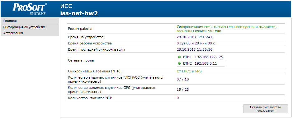 На рис. 7 представлено приветственное диалоговое окно. Там приведена актуальная информация о состоянии устройства. Не хватает, пожалуй, состояния работы устройства по протоколу PTP [3]. В левой части рисунка видно, что при непосредственном подключении устройства доступны три пункта меню: «Главная», «Информация об устройстве» и «Авторизация». Устройство нельзя параметрировать, так как сначала необходимо авторизоваться. Однако — что нам показалось очень грамотным решением — есть возможность скачать с устройства руководство пользователя.