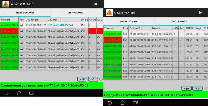 Информация о захваченных из сети GOOSE-сообщениях будет отображаться на экране планшета в виде таблицы с полями разного цвета.