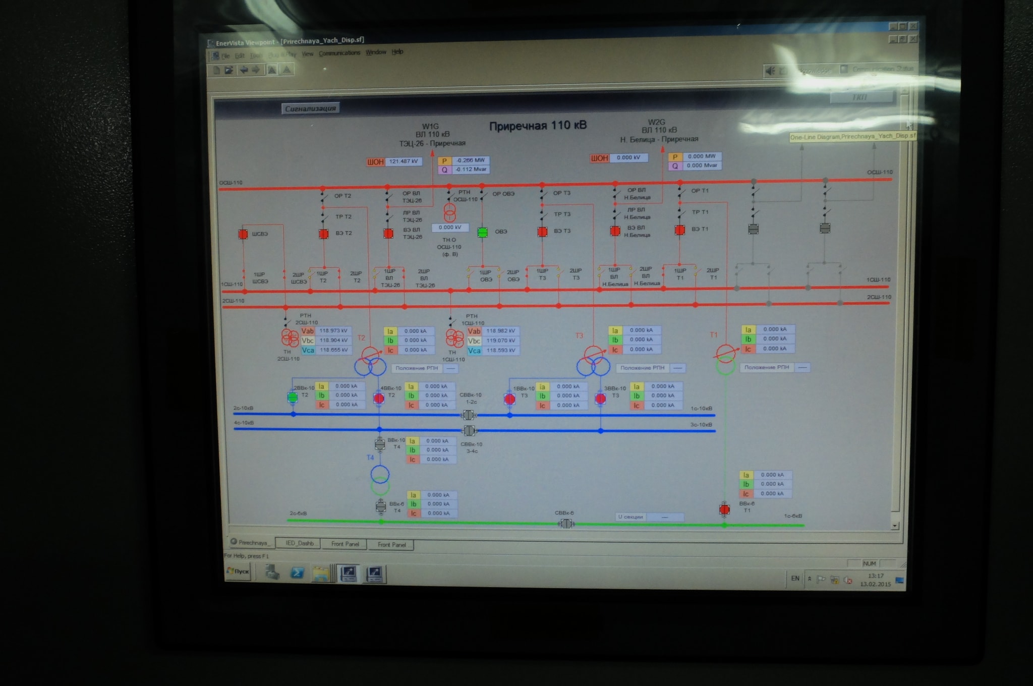 На каждом присоединении 110 кВ установлено по два модуля ввода/вывода (Brick), подключенных к разным кернам ТТ. Также на них заведены вторичные цепи ТН 1С.Ш. 110 кВ и ТН 2С.Ш. 110 кВ. Переключение с одного ТН на другой производится вручную испытательными блоками в зависимости от фиксации присоединения по системам шин. Оба устройства защиты каждого присоединения подключены к обоим Brick присоединениям, и в случае неисправности одного из Brick, автоматически переключаются на второй. Оба Brick каждого присоединения действуют на оба соленоида отключения своего выключателя. Кроме того, выполнено прямое действие ключа управления со щита управления на один из соленоидов отключения по медному кабелю.