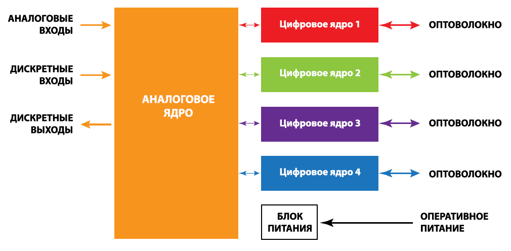 На рисунке 2 представлена схема подстанции и распределение устройств Brick и терминалов защит по кернам трансформаторов тока и напряжения. В каждом Brick имеется 4 независимых цифровых ядра и, таким образом, к одному Brick можно подключить до 4-х устройств защиты по схеме «точка – точка».