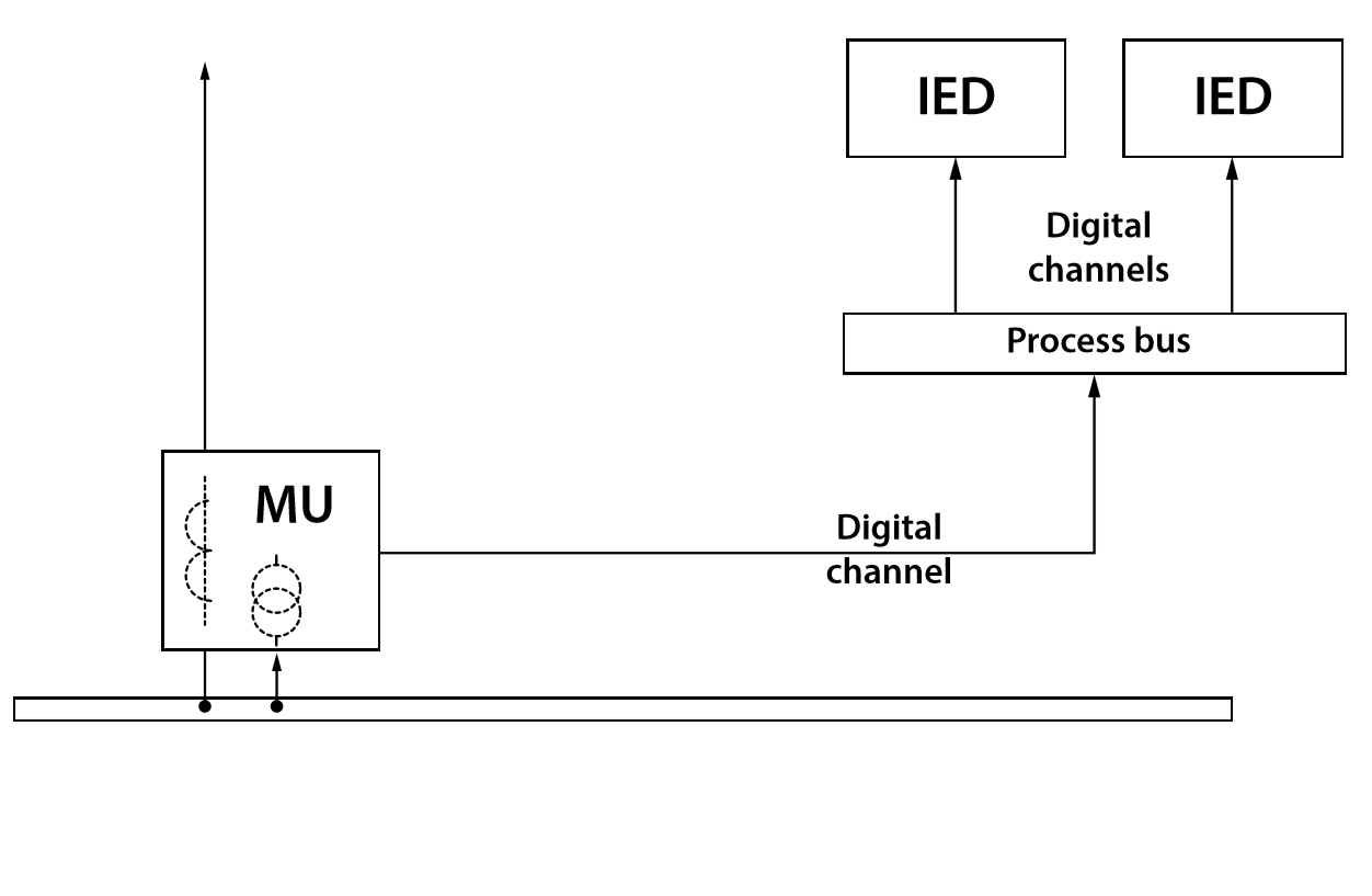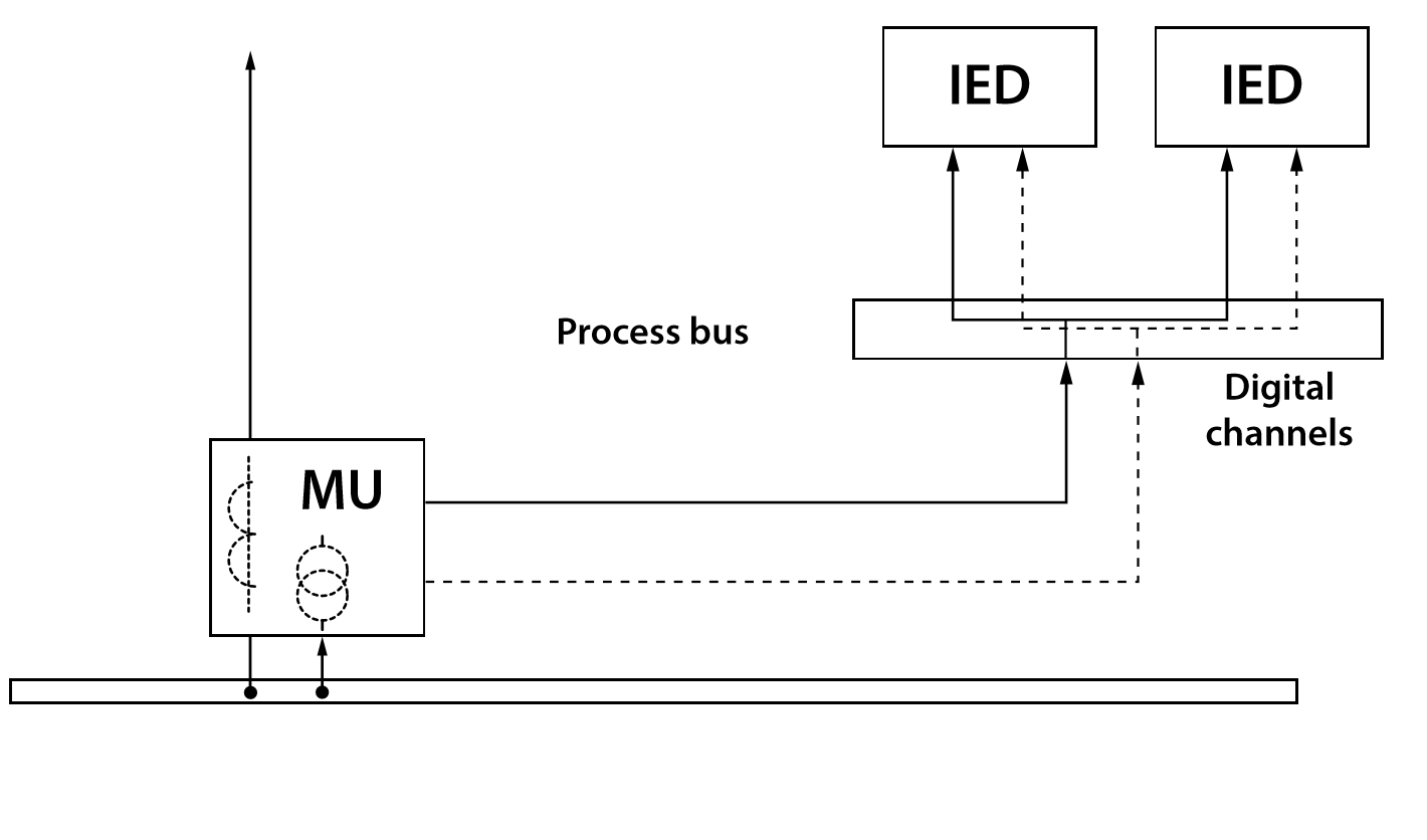 The IEC 61850 standard, which becomes more and more popular, allows digital exchange of data between (standalone) merging units and protection devices. Merging units (MUs) (Fig. 2), being an integral part of the digital substation, repeatedly digitize the analog signals and transfer them to the process bus as packets ensuring labeling and integrity of data during the transfer [1], [2]. The process bus represents a communication network, interconnecting data publishers and subscribers. Protection and control IEDs receive digital packets and process currents and voltages. The transfer of the instantaneous values of currents and voltages is required for the performance of all range of functions available in the relays. Thus, protection and control devices connected to the process bus register electric processes as sampled signals of currents and voltages in the same way as if the analog-to-digital conversion was carried out directly in the relay.