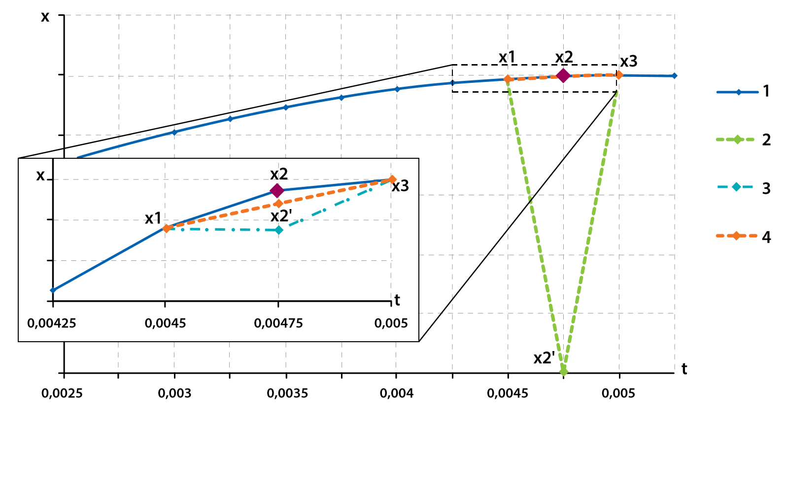 Figure 3. Methods of lost data recovery: curve 1 – original signal; curve 2 – zeroing out the lost reading; curve 3 – use of the previous reading; curve 4 – restoration of the lost sample through linear interpolation of the adjacent data points.