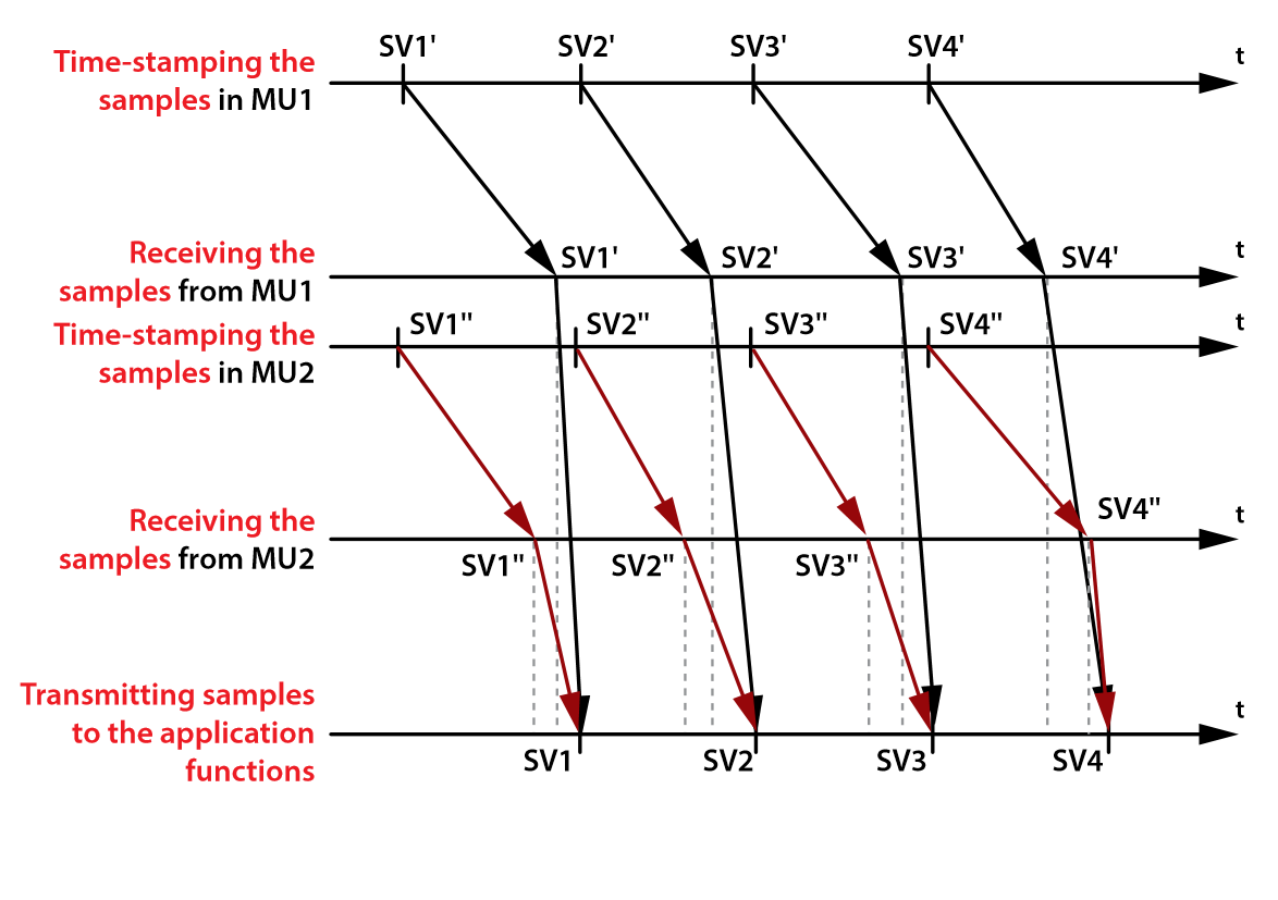 When a relay receives streams from several merging units, their time synchronization is required. To time-align the samples received from different sources, a sample counter is used, which is transferred in the data packet. The counter is incremented by one with each measurement and sets back to zero every second.