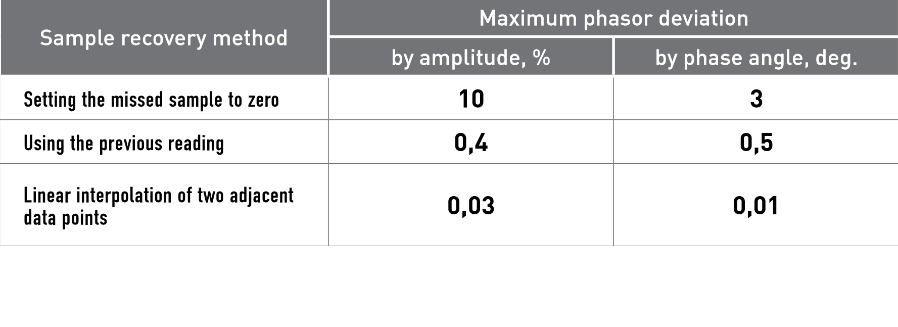 The error of each recovery method has been estimated assuming the loss of one sample per cycle of a 50 Hz sine wave. Table 1 presents the maximum deviations of the computed phasors (found through Fourier analysis) from the true one.