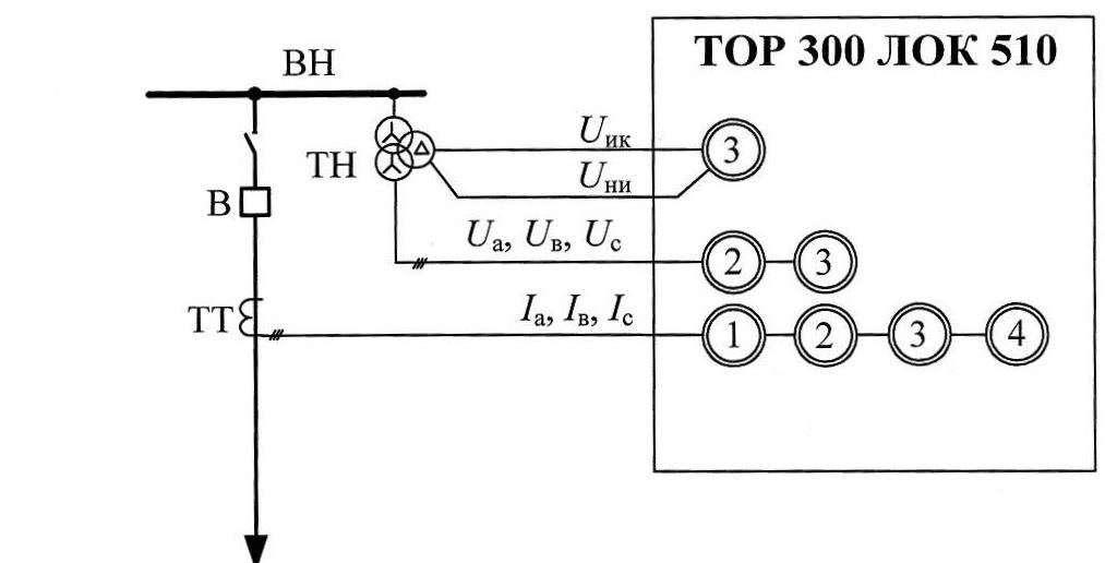 Терминал «ТОР 300 ЛОК 510» может быть установлен на линиях с ответвлениями, с односторонним или двусторонним питанием. Прибор подключается к измерительным трансформаторам тока контролируемой линии и измерительным трансформаторам напряжения секции шин, к которой подключена данная ЛЭП (см. рис. 1).