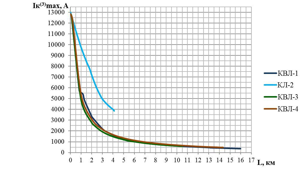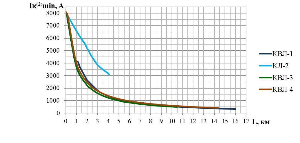 По кривым распределения токов трехфазного или двухфазного короткого замыкания по длинам ЛЭП 6 (10) кВ в максимальном и минимальном режимах работы энергосистемы.Определение места повреждения в таком случае осуществляется поэтапно.Сначала по расстоянию до места повреждения, выданному терминалом, по кривой для той ЛЭП, для которой произведен расчет уставок, определяется величина тока короткого замыкания, протекающего в первичной цепи трансформаторов тока ввода 6 (10) кВ. Затем по кривой распределения токов короткого замыкания по длине для поврежденной ЛЭП определяется длина линии до места повреждения путем проецирования точки, соответствующей полученному на предыдущем этапе току короткого замыкания, на ось длин ЛЭП. Данный способ снижает погрешность расчета, полученную при использовании поправочных коэффициентов. На примере отходящих линий 6 кВ (КВЛ-1, КЛ-2, КВЛ-3, КВЛ-4) подстанции 110/6 кВ построены кривые распределения токов короткого замыкания по длинам ЛЭП 6 кВ при наибольшем токе короткого замыкания (трехфазное короткое замыкание в максимальном режиме) и при наименьшем токе короткого замыкания (двухфазное короткое замыкание в минимальном режиме) (см. рис. 2, 3).