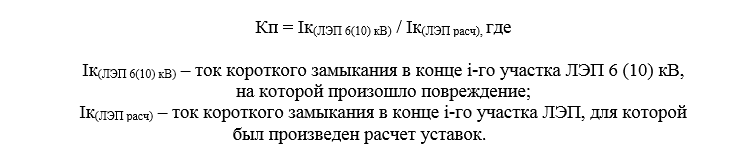 Путем перемножения расстояния до места повреждения, определенного терминалом, на поправочный коэффициент той линии, на которой произошло повреждение. Расчет поправочных коэффициентов возможно производить для различных режимов работы электрических сетей (максимальный, минимальный) и для различных видов повреждений (трехфазное короткое замыкание, двухфазное короткое замыкание). Для ориентировочной оценки места повреждения ЛЭП на практике целесообразно учитывать усредненное значение поправочного коэффициента. Поправочный коэффициент для i-го участка (километра) ЛЭП 6 (10) кВ определяется по формуле: