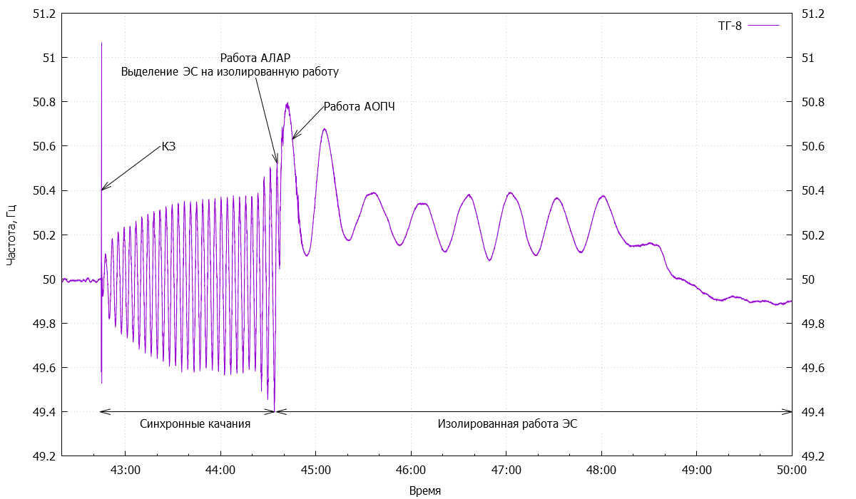 Рис. 10. Динамика изменения частоты при выделении энергосистемы на изолированную работу