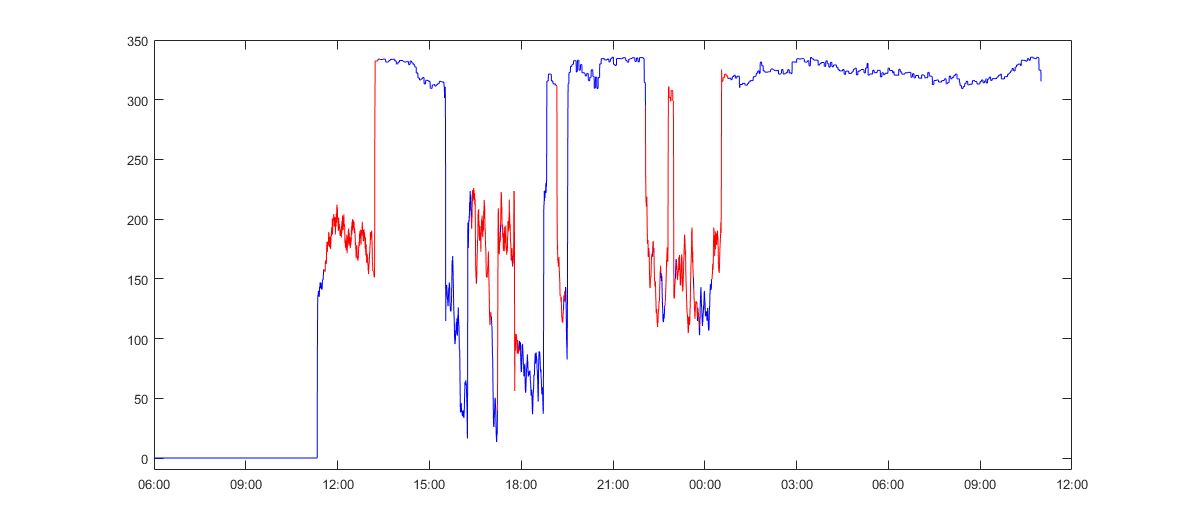 На ПС 500 кВ в ОЭС Востока была зафиксирована мода НЧК параметров электроэнергетического режима с частотой 0,47 Гц, амплитудой 7 МВт по активной мощности, 6 мГц по частоте и значительно пониженным уровнем демпфирования 70 с [7]. Для исследования причин возникновения НЧК был проведен анализ режимов работы генерирующего оборудования в данном регионе. Было определено, что резкое падение уровня демпфирования моды возникает при работе конкретного гидроагрегата одной из ГЭС в диапазоне 100–320 МВт. На рис. 12 активная мощность данного гидроагрегата отмечена красным цветом при превышении контролируемого уровня демпфирования, равного 10 с. Анализ причин возникновения данных НЧК не выявил факты некорректной работы систем регулирования генерирующего оборудования.
