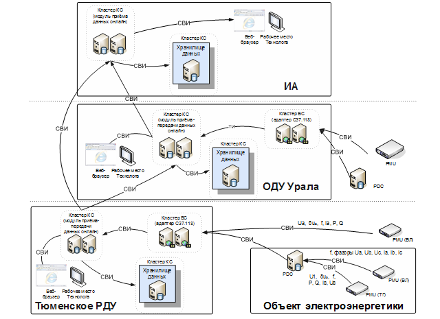 Рис. 4. Структурная схема сбора данных СВИ в Тюменском РДУ, ОДУ Урала и главном ДЦ в режиме реального времени