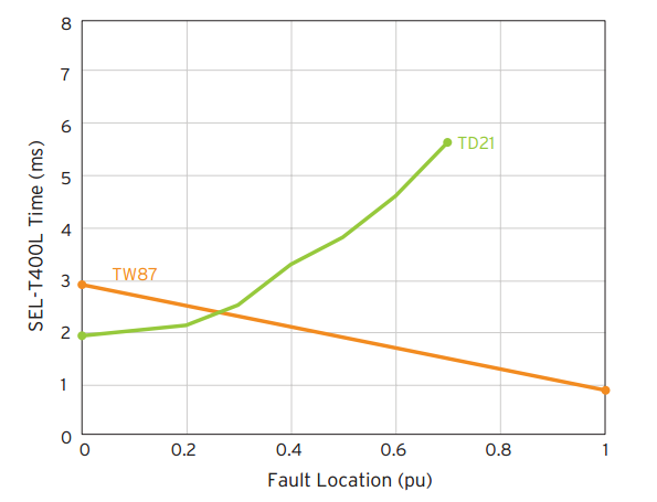Дифференциальная токовая защита линии на волновом принципе (TW87) обеспечивает быстродействие ликвидации повреждений за время в диапазоне от 1 до 4 мс, в зависимости от длины линии и места возникновения повреждения.