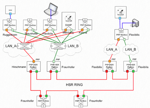 В испытаниях принимало участие оборудование производителей Hirschmann, Fraunhofer, Kyland, Ruggedcom, Meinberg, Flexibilis.Оборудование от Hirschmann, Fraunhofer и Flexibilis было объединено по схеме HSR-кольца и работало в режимах «HSR Red-Box» и «PRP-HSR Red-Box». PRP-HSR Red-Box’ы объединяли HSR-кольцо и сети «A» и «B», к каждой из которых подключались PRP-Red-Box’ы от Ruggedcom, Fraunhofer, Flexibilis, Kyland. Через PRP-Red-Box’ы к тестируемой сети подключались SAN-устройства.