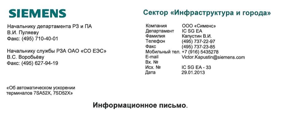 Siemens Размещенные информационные письма затрагивают вопросы организации УРОВ, использования тестовых переключателей, организации автоматического ускорения и контроля цепей напряжения, и др. Большинство писем адресовано департаментам РЗА и ПА ОАО "ФСК ЕЭС" и ОАО "СО ЕЭС".