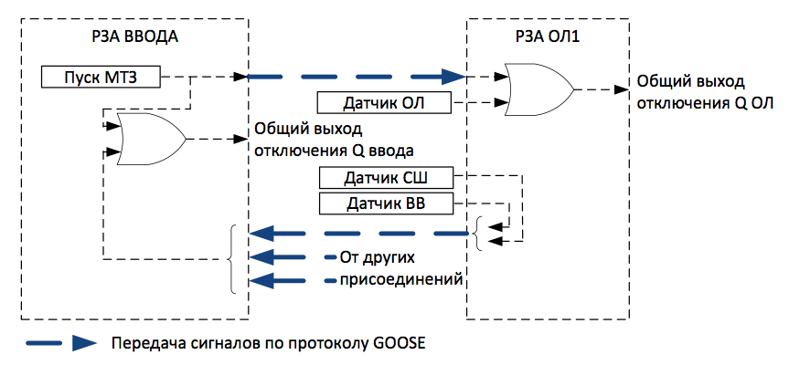 Рис. 2. Упрощенная схема передачи сигналов ДЗ по протоколу GOOSE.