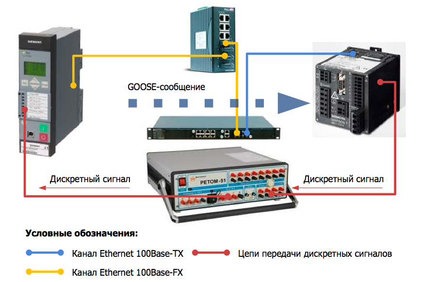 Испытательная установка РЕТОМ-51 используется для моделирования срабатывания клапана или оптического датчика дуговой защиты и приёма дискретного сигнала срабатывания устройства релейной защиты (сигнала отключения выключателя). Для моделирования срабатывания клапана или датчика дуговой защиты используются «быстрые» дискретные выходы на оптореле установки РЕТОМ-51 со временем срабатывания не более  0,4 мс. Время неопределенности считывания состояния дискретного входа РЕТОМ-51 составляет 0,1 мс. Пределы допускаемой абсолютной погрешности измерения интервалов времени с использованием миллисекундометра РЕТОМ-51 составляют ±(0,001х+0,3) мс. В рабочем варианте проекта предполагается передача сигналов между двумя устройствами РЗА типа SIPROTEC 7SJ80. На момент проведения испытаний в распоряжении не имелось двух устройств типа 7SJ80, в связи с этим в испытательном стенде была организована передача сигналов между устройством 7SJ801 и модулем ввода-вывода 7XV5673. Указанный вариант схемы можно считать приближенно эквивалентным схеме взаимодействия двух устройств 7SJ80. Устройство РЗА 7SJ801 принимает дискретный сигнал от установки РЕТОМ-51 и ретранслирует его в виде GOOSE-сообщения на коммутатор S30D. GOOSE-сообщение в режиме multicast распространяется по локальной сети по цепочке устройство РЗА 7SJ80 -> коммутатор S30D -> коммутатор S42R -> 7XV5673. Конфигурации устройств 7SJ801 и 7XV5673 интегрированы в один проект в рамках среды DIGSI и осуществлена подписка устройства 7XV5673 на GOOSE-сообщение, транслируемое устройством 7SJ801. При этом сигнал активации дискретного входа устройства 7SJ80 назначен на замыкание дискретного выхода модуля 7XV5673. Дискретный выход модуля 7XV5673 заводится на дискретный вход испытательной установки РЕТОМ-51. Испытания проводятся в режиме «Секундомер-регистратор» на РЕТОМ-51. В начальном цикле испытаний дискретный выход РЕТОМ-51 не активирован. При запуске тестовой последовательности активируется дискретный выход устройства РЕТОМ-51 и одновременно с этим запускается отсчёт таймера. Подача сигнала на дискретный вход устройства 7SJ801 приводит к передаче GOOSE-сообщения от 7SJ801 на 7XV5673 с обновленным значением соответствующего сигнала. По факту приёма и обработки нового GOOSE-сообщения модуль 7XV5673 замыкает дискретный выход, факт замыкания фиксируется испытательной установкой РЕТОМ-51 и приводит к остановке таймера. Полученное время таймера будет соответствовать полному времени передачи дискретного сигнала срабатывания датчика ДЗ до момента подачи команды отключения на силовой выключатель в шкафу ввода. Результаты испытаний В ходе испытаний было проведено 10 опытов. Среднее время передачи сигнала от момента подачи дискретного сигнала устройством РЕТОМ-51 до момент приёма дискретного сигнала составило 0,0102 с, при этом максимальное время – 0,0107 с. С учетом того, что дуговая защита строится с контролем по току, указанное время будет сравнимо со временем пуска МТЗ, в связи с этим можно сделать предварительный вывод о том, что предложенная схема подходит для реализации передачи сигналов дуговой защиты. Выводы Проведенная работа на конкретном примере демонстрирует принципиальную возможность реализации межшкафных связей в КРУ среднего напряжения посредством GOOSE-сообщений.  Исследование не претендует на полноту, поскольку в проведенных испытаниях не учитывались возможны