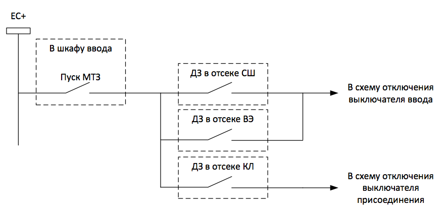 В классических проектах РЗА для реализации схему дуговой защиты с контролем по току используется схема последовательного соединения датчиков дуговой защиты с шинками, образуемыми выходом устройства РЗА ввода, формирующего разрешающий сигнал по факту пуска токов защиты. Принципиальная схема приведена рис. 1.
