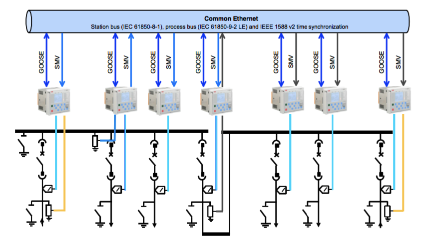 Терминалы REF615 поддерживают IEC 61850-9-2LE, что означает, что помимо напряжения, они могут осуществлять и передачу сигналов тока в цифровом формате. Однако это не имеет большого смысла в типовых условиях, когда терминалу заданной ячейки достаточно информации о токе со «своего ТТ». По этой причине, с вводом поддержки Sampled Values для этой линейки, ABB ставит акцент именно на отказ от традиционных цепей напряжения.Терминалы REF615 научили делиться напряжением по цифре