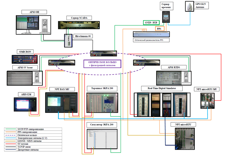 Оптические трансформаторы тока и электронные трансформаторы напряжения прошли заводские испытания по проверке метрологических характеристик, в ходе которых были подтверждены заявленные классы точности. Кроме того, для подтверждения работоспособности устройств управления и терминалов релейной защиты были проведены полигонные испытания. Основу лабораторной части опытного полигона составляет программно-аппаратный комплекс RTDS (Real Time Digital Simulator) и другие программно-аппаратные испытательные комплексы (OMICRON CMC 256 plus, RETOM-61850). Схема испытательного полигона представлена на рисунке 5. Исследование подтвердило работоспособность устройств в различных моделируемых режимах сети при возникновении повреждений.