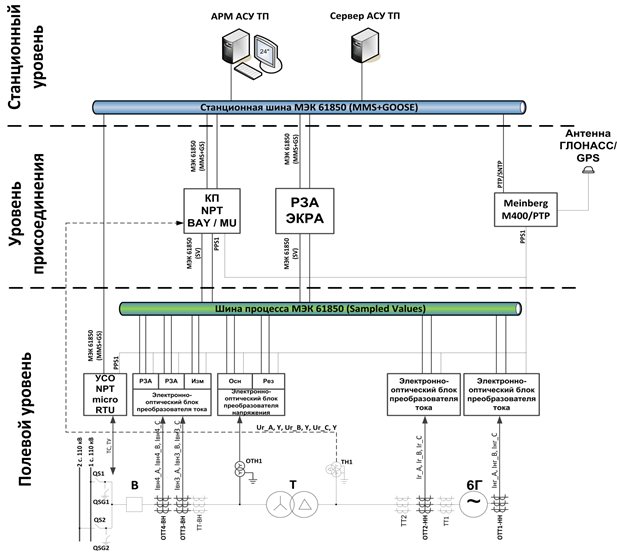 Релейная защита и автоматика данного блока уже прошла модернизацию и выполнена на базе традиционных микропроцессорных устройств, что дает возможность проводить сравнительный анализ работы существующего оборудования и внедряемого решения с цифровыми протоколами связи. Для реализации проекта выбрано оборудование отечественных производителей: оптические трансформаторы тока и электронные трансформаторы напряжения производства ЗАО «Профотек»; релейная защита блока генератор – трансформатор ШЭ1111 производства ООО «НПП ЭКРА»; контроллер присоединения NTP Bay совместно с устройством сопряжения с объектом NTP MicroRTU и система автоматического управления и контроля цифрового оборудования NTP Expert производства ООО «ЭнергопромАвтоматизация»; счетчик электроэнергии ARIS производства ООО «Прософт – Системы» (рис. 1). Кроме того, в систему интегрирован шкаф защит блока производства ЗАО «ВНИИР», выполненный на базе терминалов АВВ REG670.