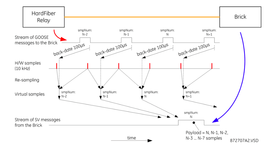 Действительно, если обратиться к руководству эксплуатации, то можно увидеть, что в этой системе устройства РЗА управляют процессом взятия выборок на Brick. Это управление осуществляется посредством передачи ими на Brick GOOSE-сообщений. Каждый Brick берет выборку, соответствующую 100 мкс назад по отношению к моменту фиксации окончания кадра Ethernet «командного» GOOSE-сообщения, и упаковывает эти данные в кадр 9-2. Точнее упаковывает 8 групп этих данных, соответствующих различным моментам времени. Помимо четырех токов и четырех напряжений (или еще дополнительно 4 токов), каждая группа данных дополнительно включает низковольтные сигналы постоянного тока (от различных датчиков, например, температуры) и дискретные сигналы на входных/входных интерфейсах Brick, соответствующие определенному моменту времени. Все эти сигналы представляют собой один набор данных. Другой набор данных передается в этом же сообщении 9-2 и включает в себя служебную информацию.