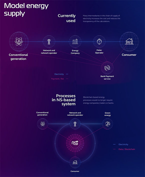 Созданная в результате реализации проекта блокчейн‑платформа позволит решить ряд основных проблем энергетической отрасли. Платформа NS способствует энергосбережению и управлению электроэнергией, обеспечивает взаимодействие производителей электроэнергии, операторов электросети, органов регулирования и потребителей.