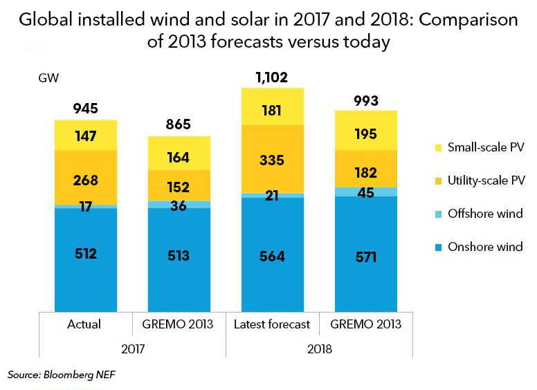 По оценке компании Bloomberg New Energy Finance (BNEF), в первом полугодии 2018 года суммарная установленная мощность солнечных и ветровых электростанций в мире превысила 1 000 ГВт — на 30 июня 2018 года этот показатель составил 1 013 ГВт. На материковые ветровые электростанции приходится 523 ГВт, на офшорные ВЭС — 19 ГВт; малые солнечные электростанции дают 164 ГВт, промышленные СЭС — 307 ГВт. На текущий момент по установленной мощности незначительно лидирует ветроэнергетика (54%), но ожидается, что фотоэлектрическая солнечная энергетика станет лидером в начале 2020-х годов. Также авторы отчета предполагают, что к концу 2018 года установленная мощность СЭС и ВЭС достигнет 1,1 ТВт. Достижение 1 000 ГВт солнечно-ветровой генерации заняло 40 лет, при этом более 90% данных мощностей были введены в эксплуатацию в последнее десятилетие. По прогнозу BNEF, что следующие 1 000 ГВт будут построена всего за 5 лет — к началу 2023 года. На первую тысячу было потрачено $2,3 млрд, вторая будет стоит 1,23 млрд. Примерно треть суммарной установленной мощности ветровых и солнечных электростанций приходится на Китай, и очевидно, что он останется лидером и в ближайшем будущем. В странах Азии размещено 58% всех солнечных электростанций и 44% ветровых. «Достичь одного тераватта — это колоссальное достижение для ветровой и солнечной энергетики, но это только начало. Ветроэнергетика и фотовольтаика выигрывают в плане экономики, так что эта веха — первая в череде последующих», — отмечают авторы отчета. [bnef.com]